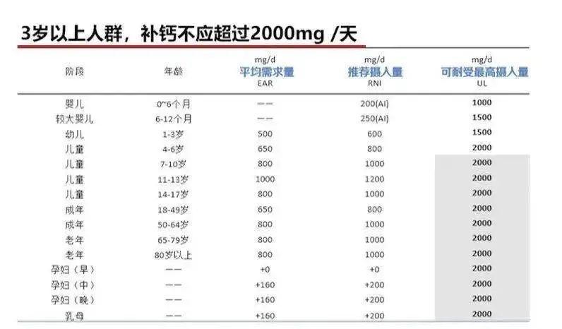 过量补钙?小心伤身!科学补钙应该这样做 钙摄入过量也会对身体造成伤害吗?如何补钙才正确?一起来了解 划重点1:不同人群对钙的需求根据中国营养学会的推荐,每日钙的摄入量因人群而不同。 【数据来源:中国居民膳食营养素参考摄入量(2013版)】 建议:3岁以上人群,补钙不应超过2000mg/天 划重点2:钙...[详细]