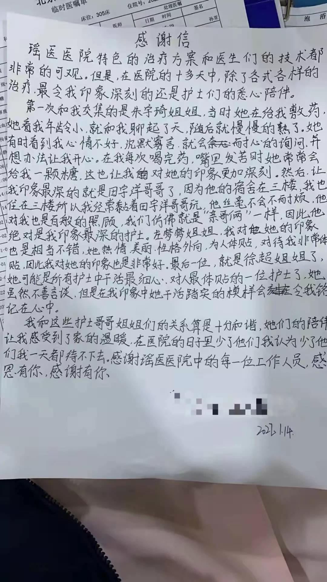 今天下午北京瑶医医院护理高干病区收到一封特别的感谢信,来自一位年仅14岁的小患者,这是一封亲笔手写的感谢信,语言质朴,感情真挚,诉说着小患者与医生之间特殊的情感。 在信中小患者将护士们称为“哥哥姐姐”,刚入院时的他心情低落,沉默寡言,不喜欢说话,“哥哥姐姐们”会陪他聊天,想各种办法逗她开心。会在喝发苦的药时,给他...[详细]